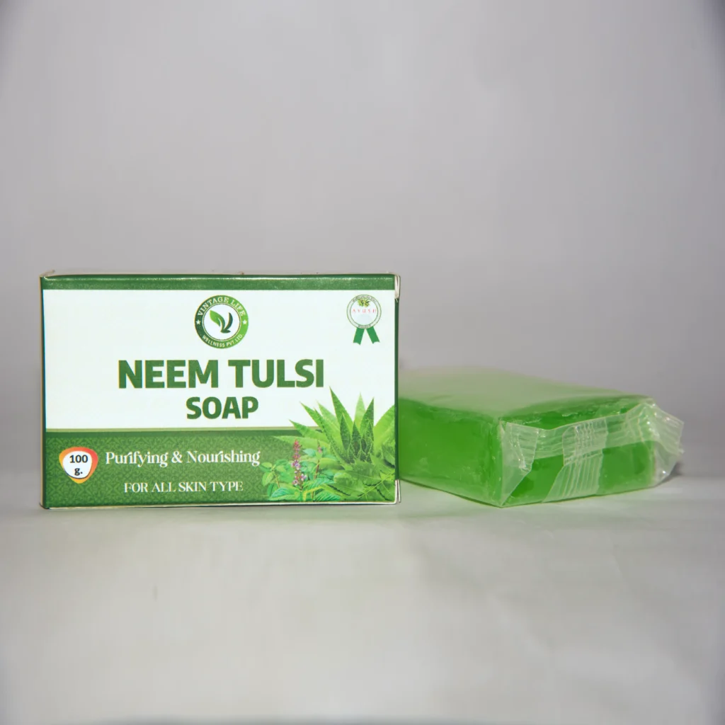 Neem Tulsi Soap by Vintagelife Wellness offers gentle cleansing with natural anti-bacterial properties to help maintain healthy, acne-free, and refreshed skin.